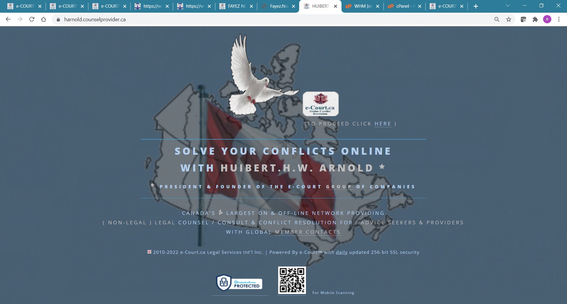 Here e-Court℠ steps in and now offers the approx. 85,000 professionals in CA a platform with personal dashboard ( full of very useful functions ) and their own domain website with a relevant name for a fraction of cost via traditional routes ( Yes you read this correctly ! ) Example : Mr. Huibert.H.W. Arnold receives his own domain adress. This domain address tells potential clients Mr. Arnold's name and that he is a counsel provider in Canada. When you click on H.Arnold you will see that the website is fully secure and that the visitor can click to reach additional webpages which not only provide useful links but also an instant route to communicate ( click on " We are Here" to reach Huibert Arnold personally - or a 3rd party can be hired to provide instant answers. Written text messages in lieu of instant communications are send automatically to the email box of Mr. Arnold and are free of any costs ).